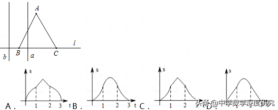 牛刀小试:2.(2018•莱芜)如图,边长为2的正△ABC的边BC在直线l上,两条距离为1的平行直线a和b垂直于直线l,a和b同时向右移动(a的起始位置在B点),速度均为每秒1个单位,运动时间为t(秒),直到b到达C点停止,在a和b向右移动的过程中,记△ABC夹在a和b之间的部分的面积为s,则s关于t的函数图象大致为( )
