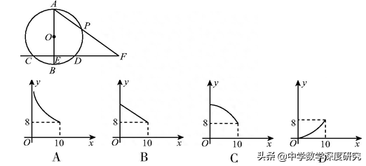 例4.如图,☉O的直径AB垂直于弦CD,垂足为E,P为☉O上一动点,P从A→D→B在半圆上运动( 点P不与点A重合 ),AP交CD所在的直线于点F,已知AB=10,CD=8,记PA=x,AF为y,则y关于x的函数图象大致是 ( )