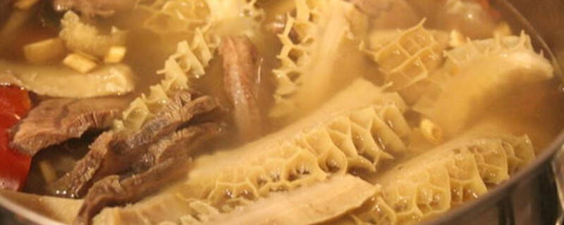 将汤汁煮沸之后调整至小火慢慢煮,熬煮一个半小时的时候可以加入一些香菇、金针菇等食材提鲜,最后再熬煮半个小时即可出锅。将牛肚捞出来之后切成丝备好,可以用来凉拌或者炒菜,口感都非常好。
