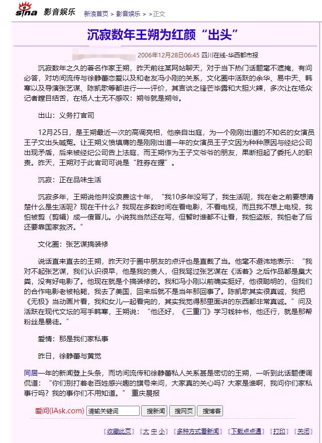 沉寂数年王朔为红颜“出头” 2006年12月28日06:45 四川在线-华西都市报