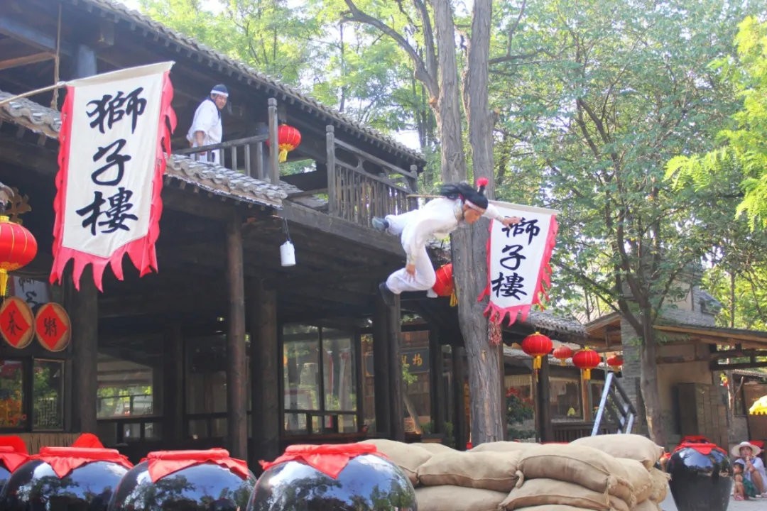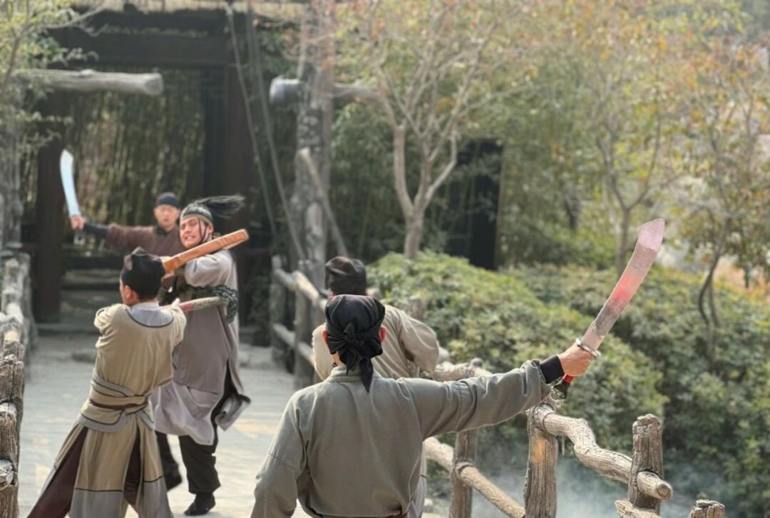 看完大型实战演出《三打祝家庄》,可以到水浒街观看白龙和黑凤的斗鸡,可以下注赢银票,同期还会演出梦回水浒情景剧《水浒系列剧》,中午可以在水浒街吃午餐,同时还可以观看猴戏表演。