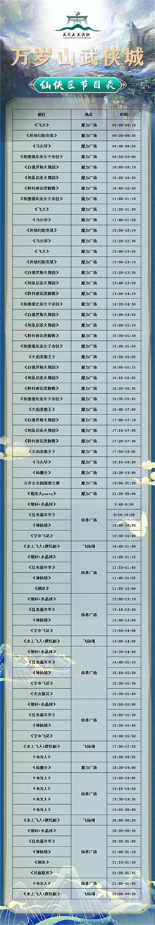 旅游小贴士:建议游客朋友提前了解景区的表演时间表,并合理安排时间,尽情领略武侠文化的精髓。附上万岁山·大宋武侠城比命还长的节目单,日常两百多场节目!
