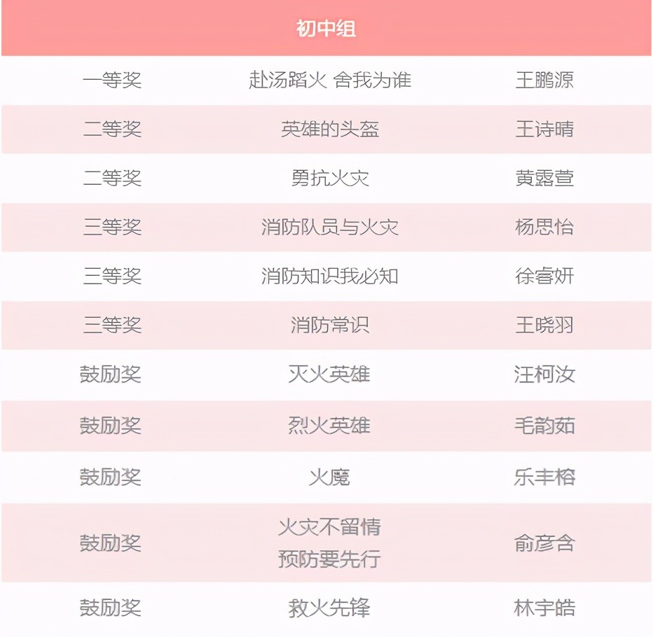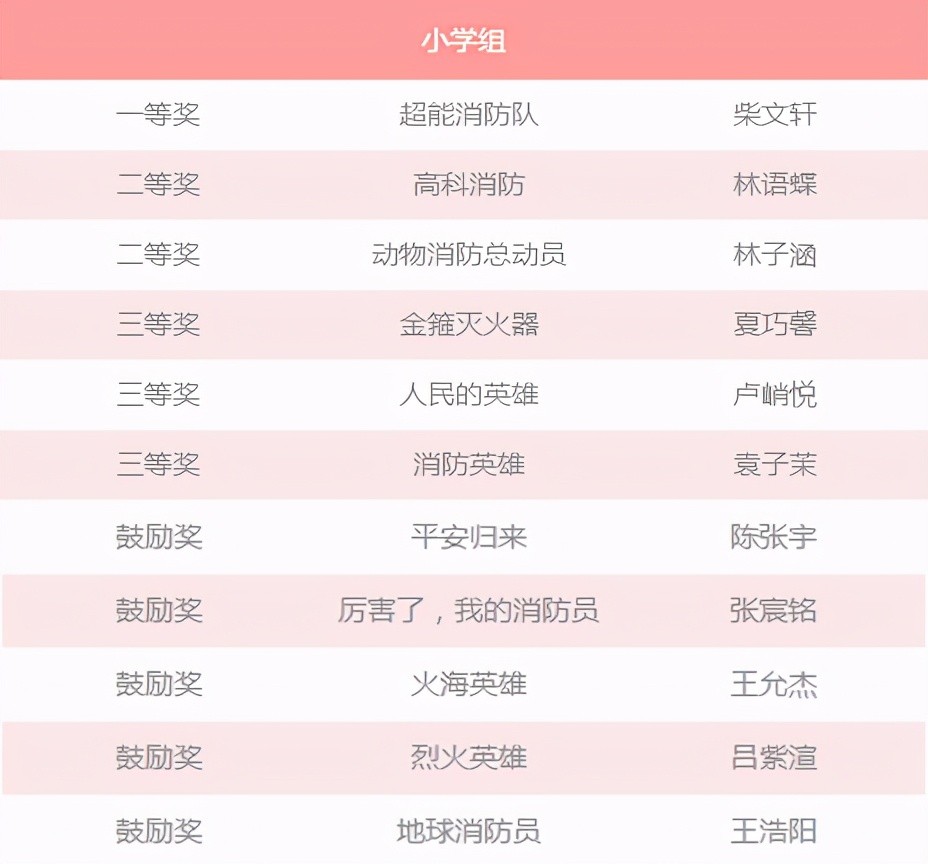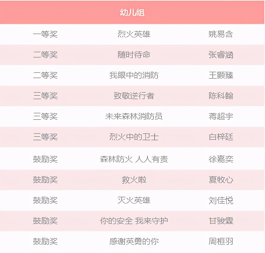 活动开展以来,在全市各中小学生、幼儿园小朋友积极参与下,涌现出许多优秀绘画作品,共计300余幅。因幼儿组、小学组优秀参赛作品数量较多,特增加了获奖组别及名额。最终,经学校美术老师、媒体记者及消防指战员组成的评审团最终评定,共决出幼儿组、小学组、初中组各组一等奖一名、二等奖二名、三等奖三名、鼓励奖五名。