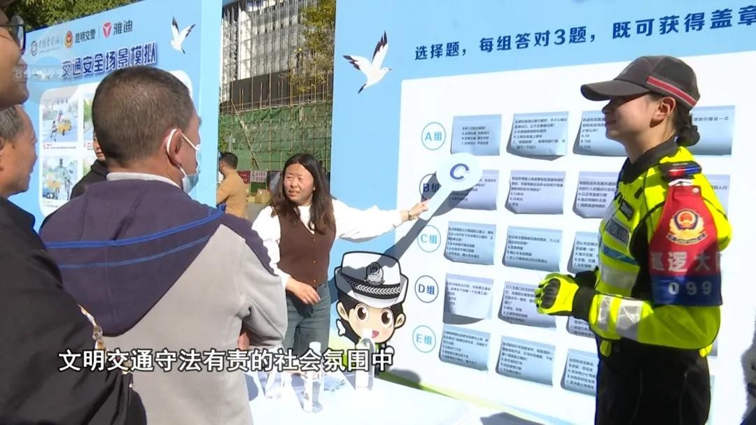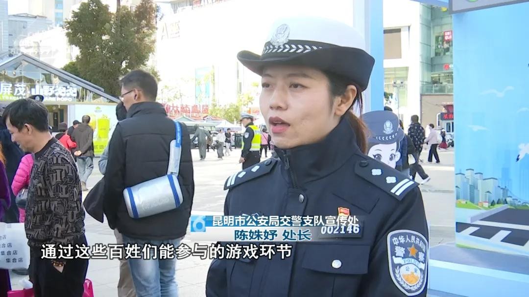 昆明市公安局交警支队宣传处 处长 陈姝妤:“通过这些百姓们能参与的游戏环节,从中学到交通法规的同时,也树立文明安全出行的理念。”
