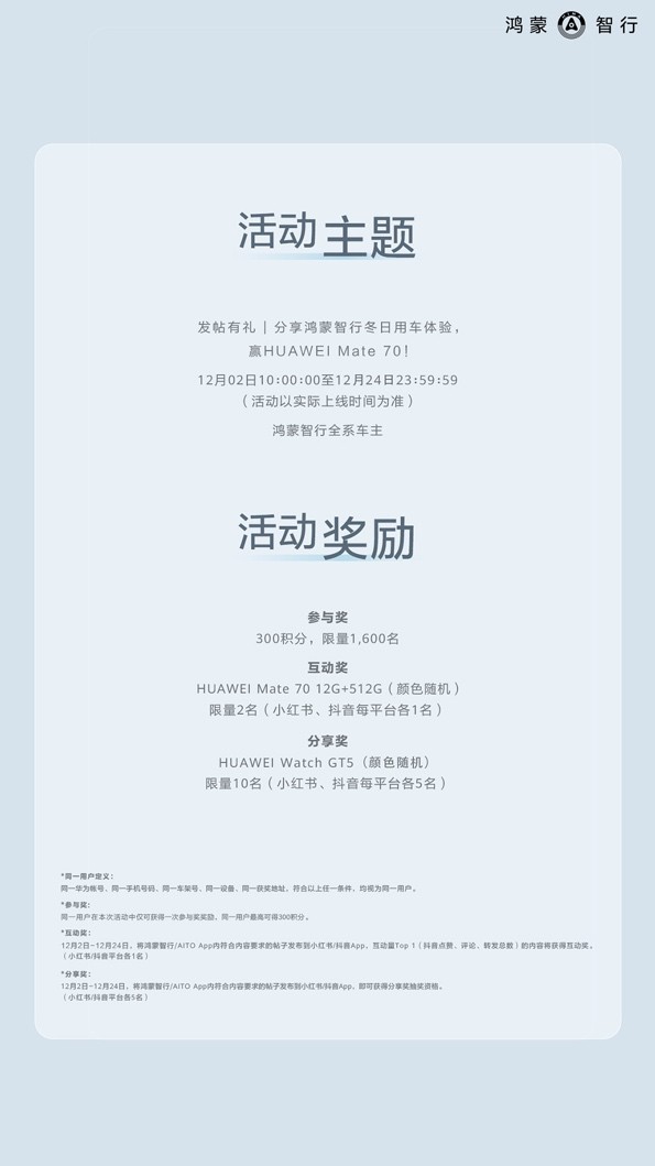 12月2日,鸿蒙智行官方于线上发起了一场面向广大用户的“鸿蒙智行冬日奇驭智旅”有奖征集活动,旨在吸引广大车主参与及分享自己的冬季用车tips,共同探索更加舒适、安全、智慧的冬日出行方式。