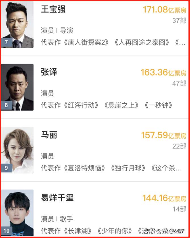 “百亿影人”前十强的其他7位演员,刘昊然、李晨、张涵予、王宝强、张译、马丽、易烊千玺个人票房累计分别为179.35亿元、178.11亿元、177.59亿元、171.08亿元、163.36亿元、157.59亿元、144.16亿元。